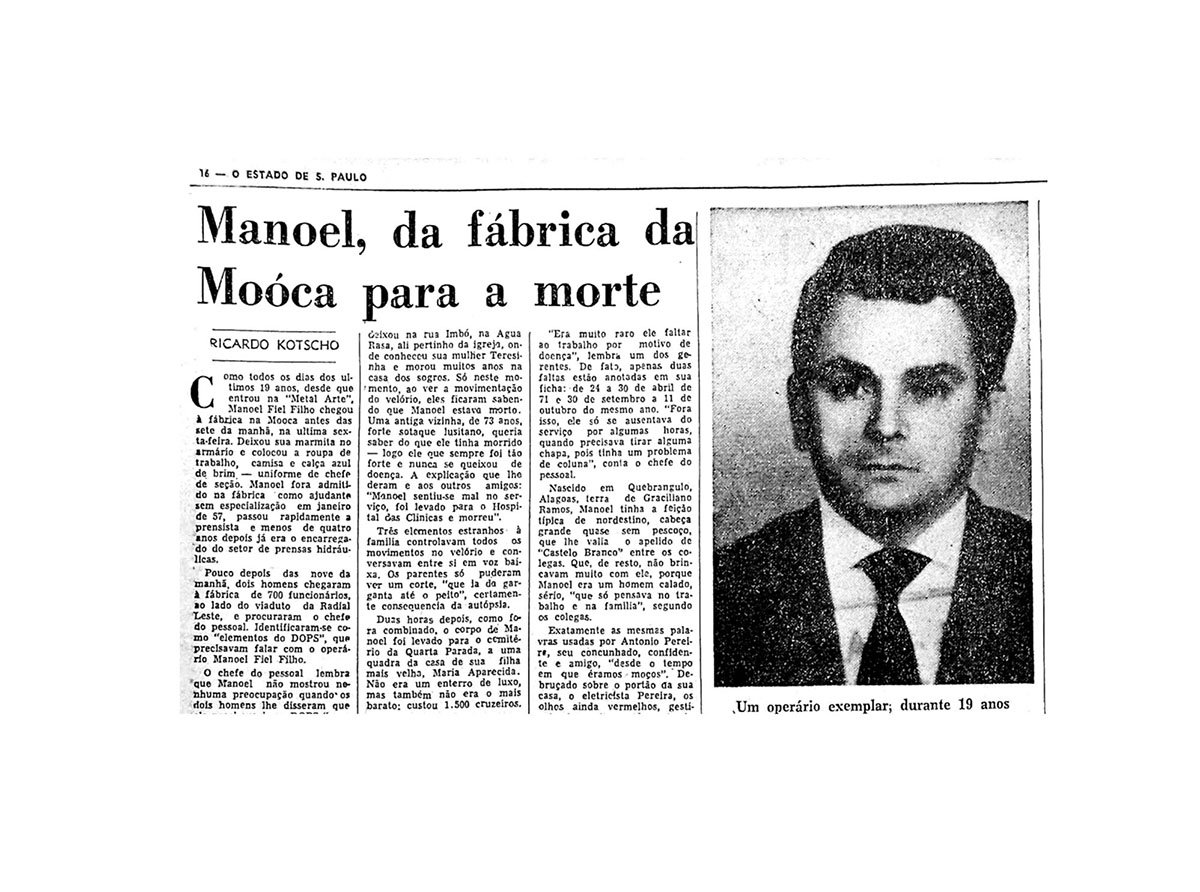 Dia 17 de janeiro de 1976, a ditadura prendeu, torturou e matou o prensista Manoel Fiel Filho, que trabalhava numa metalúrgica em São Paulo. Neste ano, o bárbaro assassinato completa meio século. Não havia inquérito policial ou acusação formal contra o trabalhador.